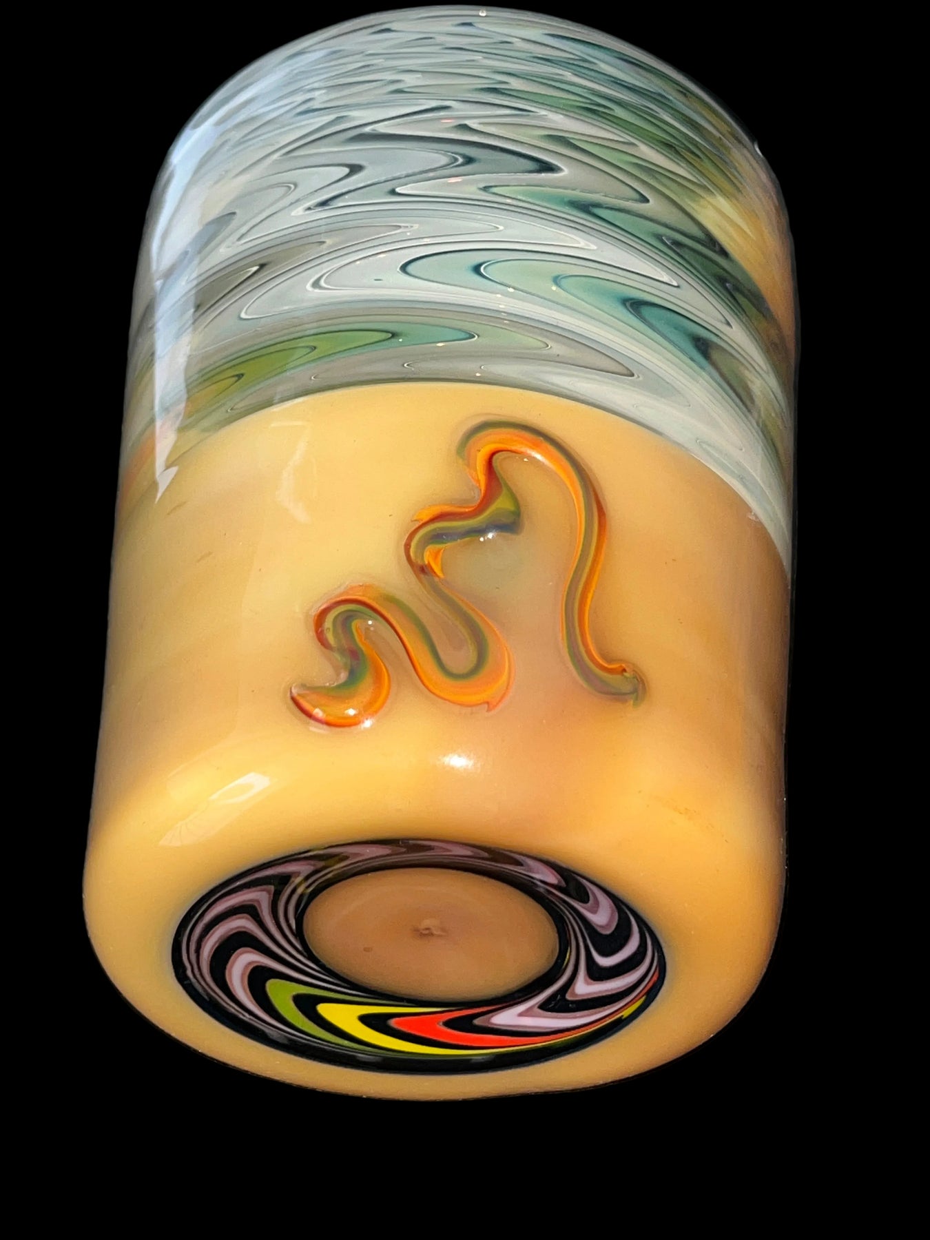 Large cup with a skate wheel pattern on the underside, and a "fume" wigwag section made with Silver and Gold. Made with Mark Nicely in Humboldt CA.  Has some small imperfections.
