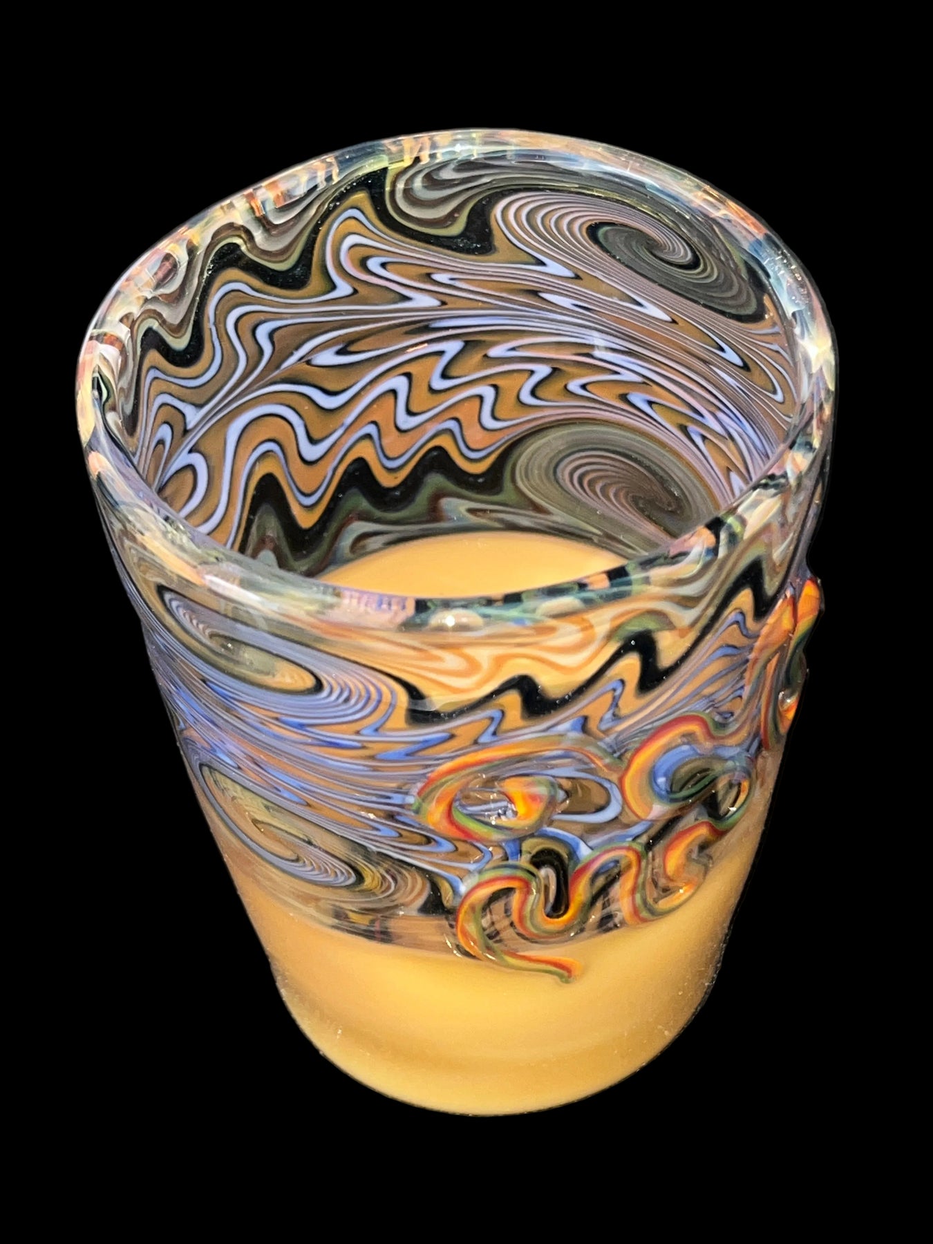 Glass cup with a skate wheel pattern on the underside, and two wigwag sections made with Silver and Gold. Made with Mark Nicely in Humboldt CA. Approximately 6" tall